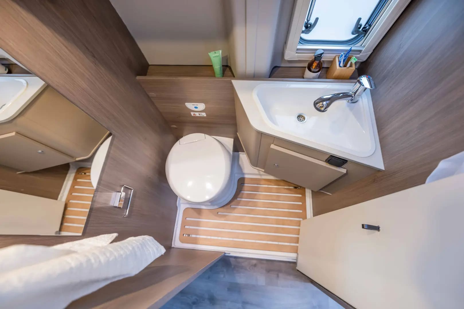 Eine funktionale und platzsparende Weiterentwicklung ist die Falttür des Badezimmers. In dem komfortablen Bad kann dank des Fensters schnell und einfach gelüftet werden.
