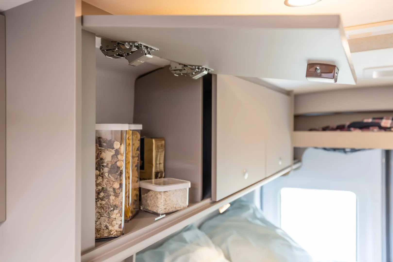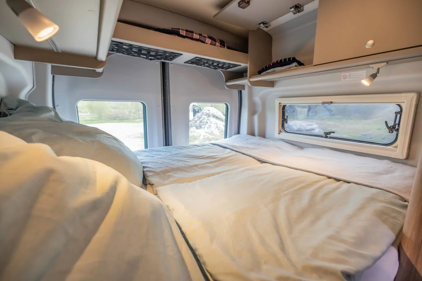 Im Heck des Fahrzeugs gibt es großzügige Ablageflächen und Schränke, die um das 1,92 bzw. 1,89 m x 1,47 m Querbett angeordnet sind. Optional kann durch einen Sitzbankumbau im Wohnbereich ein weiteres Bett für eine dritte Person integriert werden.