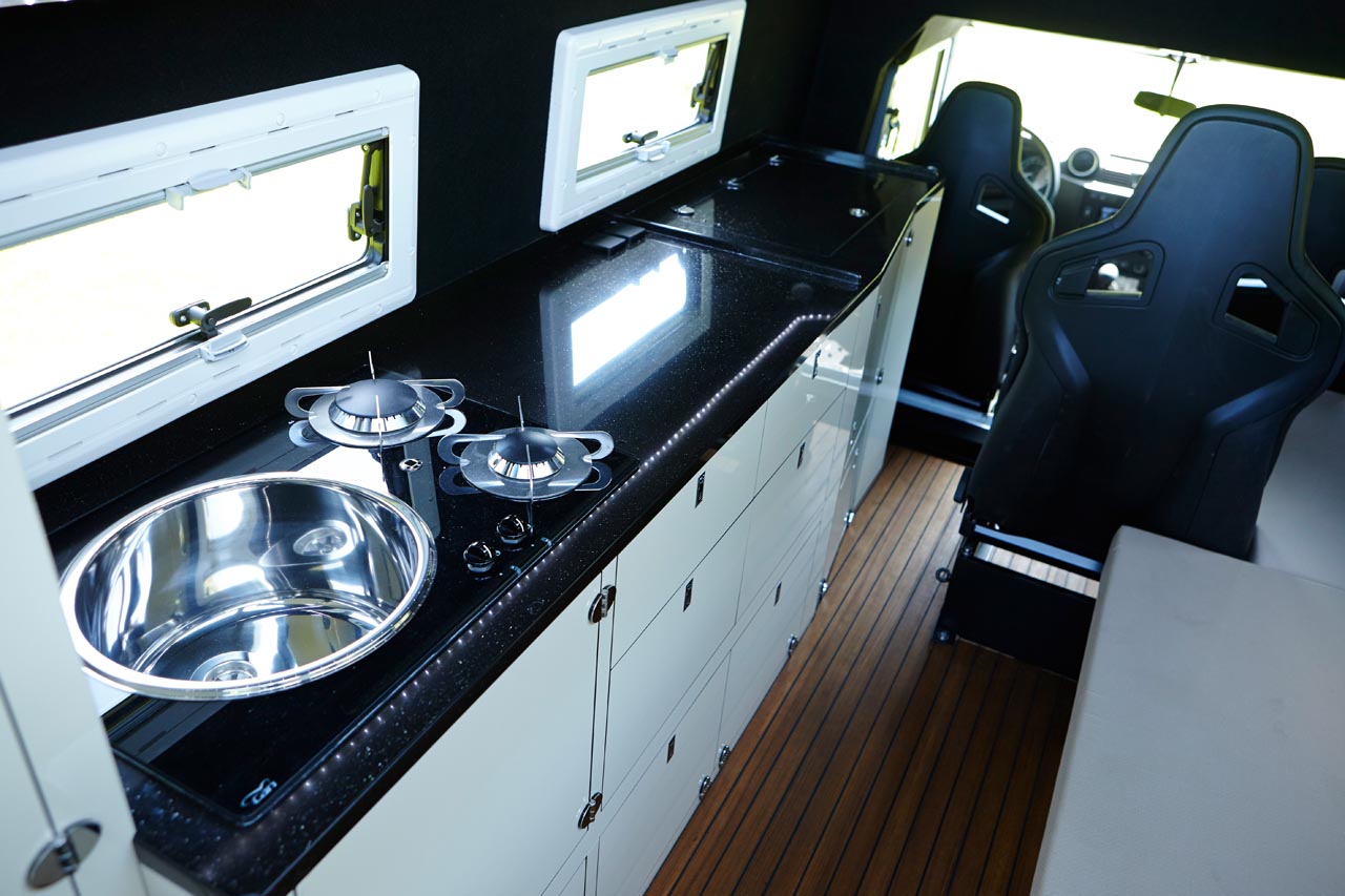 Für den Hardcore-Camper, den es in die Sahara oder nach Alaska zieht, hat Matzker eine Isolierung verbaut, die sowohl vor Hitze als auch extremer Kälte schützen soll. Eine Webasto Airtop 2-kW-Luftheizung mit Luftverteilungssystem sorgt für warme Füße, während draußen die Pinguine vorbeilaufen. Natürlich nicht in der Sahara. Dort ist eher der 55-Liter-Wassertank hilfreich, der von 45 Litern in mobilen PE-Flaschen ergänzt wird. Ach ja – Kraftstoff ist auch immer nützlich, wenn man unterwegs ist. Dafür hat Matzker einen Spezial-Tank für das mdx Expeditionsmobil entwickelt, der aus Leichtmetall besteht, 125 Liter fasst und den serienmäßigen Kunststofftank ersetzt.