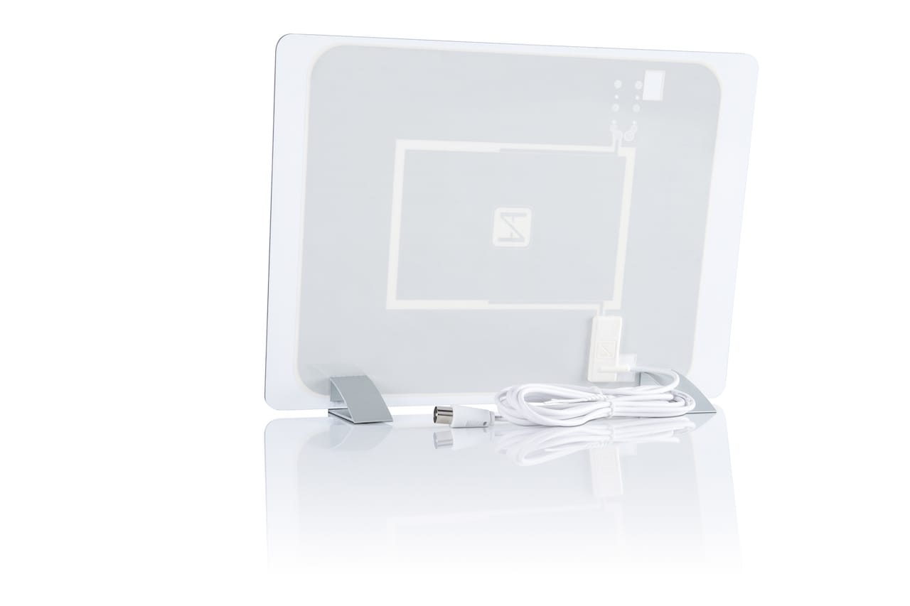 Diese aktive DVB-T-Antenne ist für Innen und Außen konzipiert und kann damit sowohl beim Camping als auch zuhause eingesetzt werden. Sie besteht aus einer dünnen Folienantenne, die auf einer hochwertigen, bedruckten Acrylglasscheibe aufgebracht wird. Die patentierte Folie stammt ursprünglich aus dem Automobilbereich und ist durch eine spezielle Filtertechnik resistent gegen Störsignale anderer TV- oder Elektrogeräte. Durch den integrierten Signalverstärker bleibt das Fernsehbild auch mit einem schlechten Empfangssignal brillant.