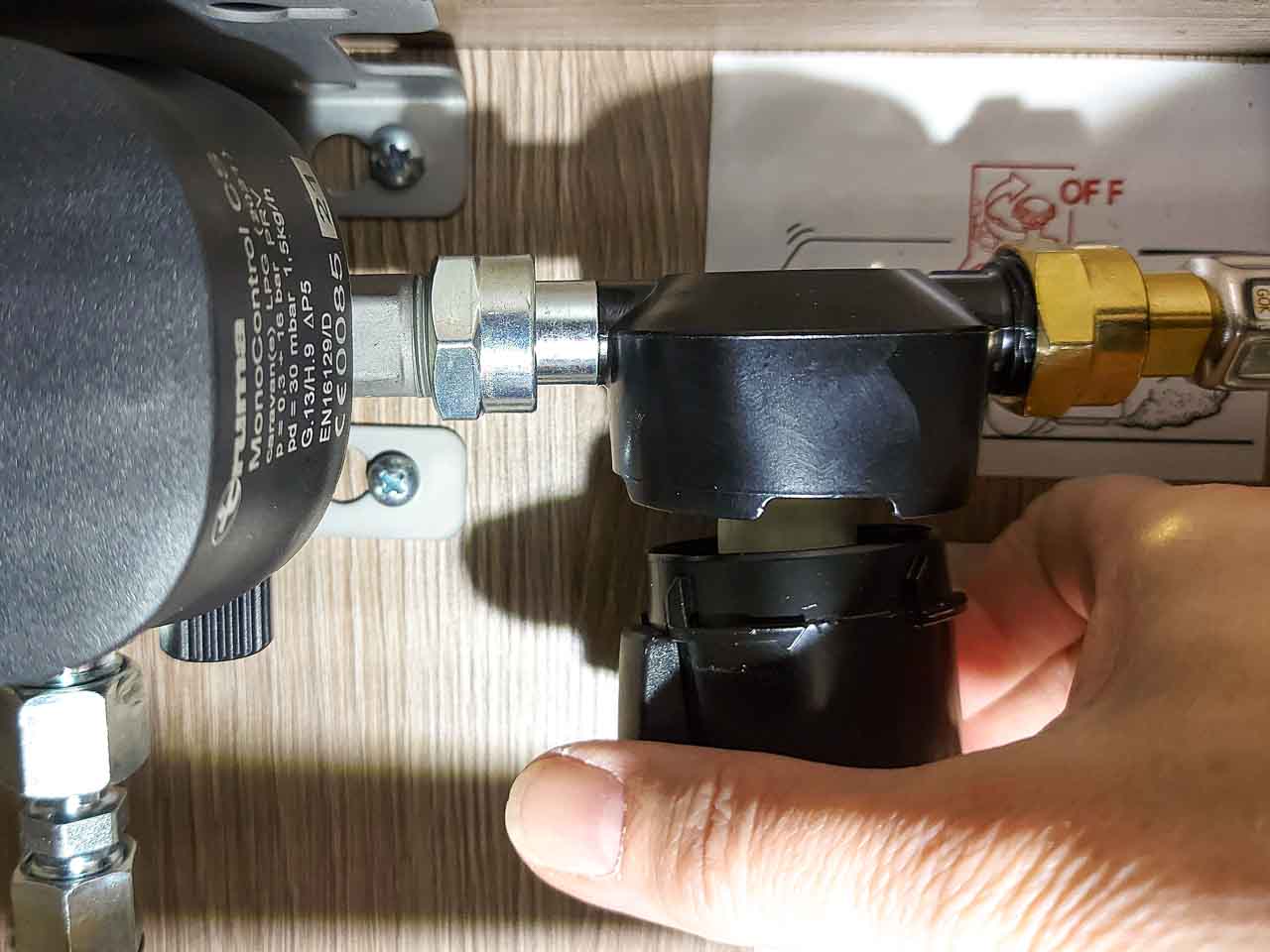Wie du weißt, ist bei Arbeiten am Gas immer Vorsicht geboten. Wenn du jedoch die Gaszufuhr stoppst und das Ventil der Flasche zudrehst, kann nichts passieren. Falls sich Reste in der Leitung befinden, kannst du diese durch Zünden einer Kochstelle verbrennen. Nun lässt sich der Gasfilter problemlos selbst nachrüsten.
