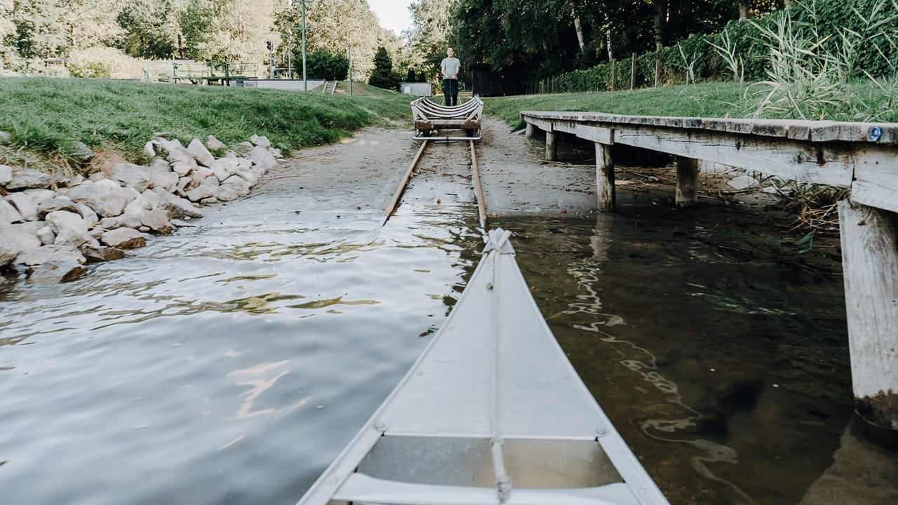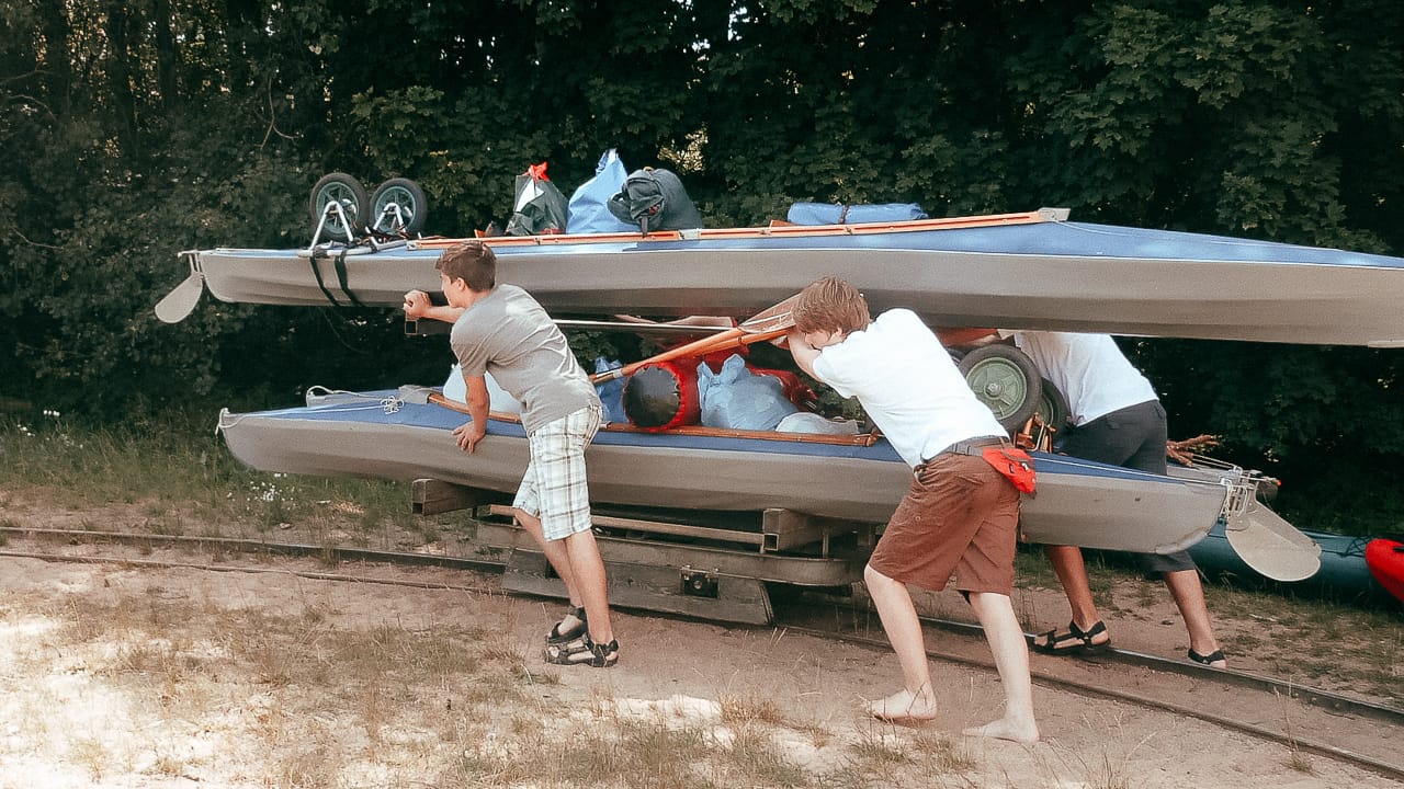 Der Havelkanal ist hier zwischen dem Schulzensee und dem Pagelsee für ganze 800 Meter unterbrochen. Für uns heißt es nun aussteigen, ausladen und diese Stelle zu Fuß umgehen. Für den Transport unseres (doch recht schweren) Kanadiers steht zum Glück eine Metalldraisine bereit. Mit etwas Schwung und reichlich Kraft findet dieses schnell ein passendes Plätzchen auf dem Wagen und schon geht die Fahrt los. Gemeinsam mit einigen anderen Kanuten schieben wir den nun 5 Boote schwereren Wagen Schritt für Schritt zur Einsetzstelle am Pagelsee. Puh, der heutige Tag verlangt uns ganz schön Muskelkraft ab. Dennoch: Was für ein Abenteuer!