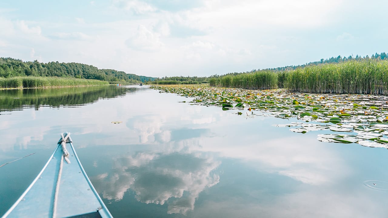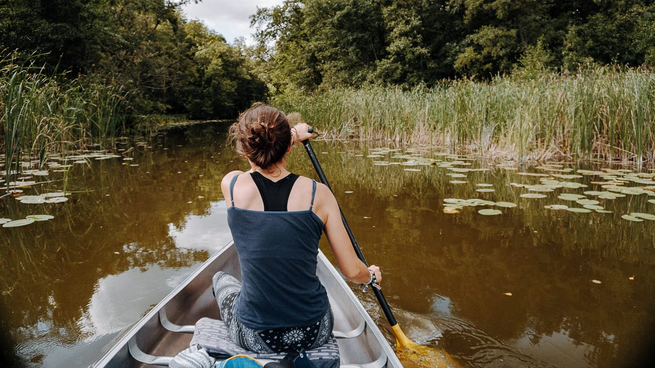 Von nun an kommen wir mit unserem Kanu viel entspannter voran. Ohne Gegenwind scheinen wir durch die engen Kanäle zu fliegen, so leise und fließend bewegen wir uns. Die Zeit vergeht schnell, dann sehen wir schon die erste Umtragestelle.