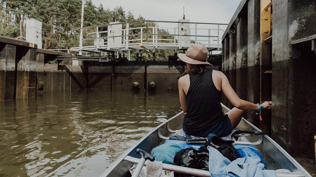 Immer wieder halten wir Ausschau nach dem Zeichen für den Kanal. „Ach, guck mal da ist es!“, plötzlich taucht das große, weiße Quadrat hinter ein paar Büschen und Bäumen auf. Wir schnappen unsere Paddel und mit kräftigen Zügen schieben wir unser Kanu in den Kanal hinein. Weit kommen wir nicht, denn im Kanal erwartet uns bereits das nächste Abenteuer: Die erste Schleuse!