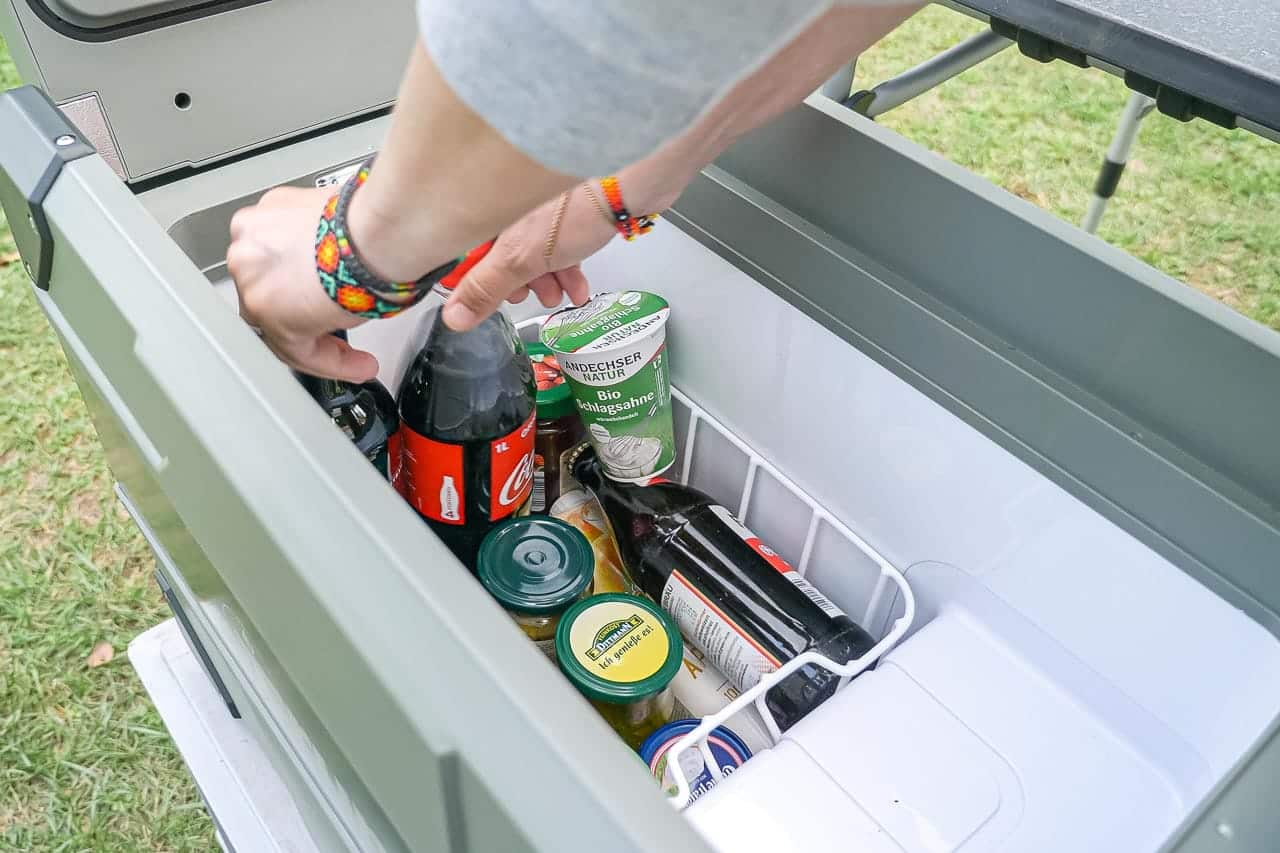 Im Inneren sind zwei herausnehmbare Körbchen untergebracht, mit denen sich das Kühlgut organisieren lässt. Die Kühlbox bietet genug Platz für aufrechtstehende größere Flaschen, auch Weinflaschen und 1- bzw. 1,5-Liter-Colaflaschen können so transportiert werden. Wie viel wirklich reinpasst, haben wir beispielhaft getestet und dokumentiert, die Infos dazu gibt es unter „Erste Beispieltests“.