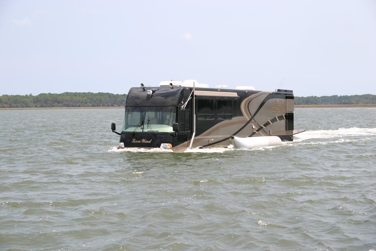 Das Luxus-Wohnmobil ist 13 Meter lang und 18 Tonnen schwer. Klingt nach dem Untergang der Titanic. Doch das Fahrzeug kann tatsächlich einfach von der Straße aus in einen Fluss oder See gesteuert werden. Dafür klappen sich noch nicht einmal die Räder des Terra Winds ein. Der Fahrer entscheidet per Joystick, ob er den Straßen- oder Bademodus nutzen möchte. Berührt das Reisemobil Wasser, wird es automatisch von seitlichen Schwimmern gehalten und von zwei Bronze-Propellern angetrieben, die etwa einen halben Meter groß sind.