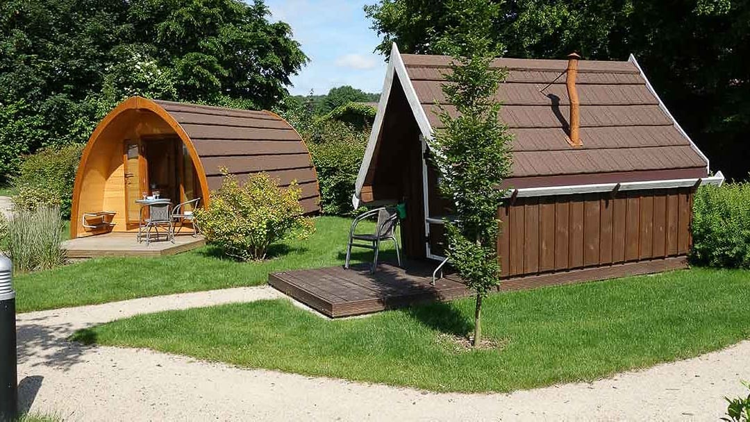 - Zum Mieten: Chalet, „Lodge“, Campingfass („Pod“), Hexenhäuschen