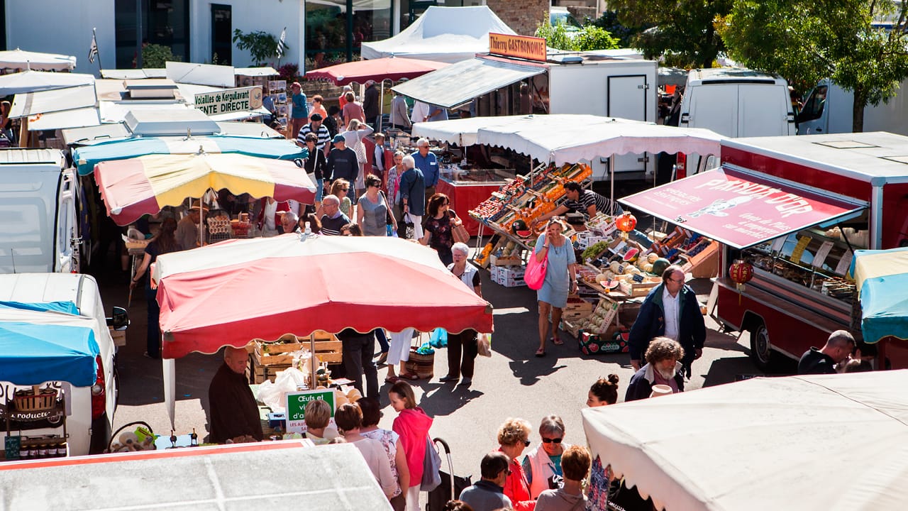 Wochenmärkte kannst du in nahezu jeder kleinen Stadt finden, vor allem in den Sommermonaten sind sie gut bestückt. Auf vielen Wochenmärkten erhältst du neben frischem Obst und Gemüse Fleisch- und Wurstwaren, lokale Spezialitäten, Käse, Fisch aber auch Bekleidung, Kinderspielzeug und Haushaltswaren. Bei den Spezialitätenständen wirst du oft zum Verkosten eingeladen. Also greif zu, wenn es verführerisch nach Salami oder Calvados duftet. Apropos duften: Einen verführerischen Duft verbreiten auch die Food-Trucks auf dem Markt, wenn du nicht allzu lange anstehen möchtest, solltest du deine Bratwurst vor der Mittagszeit genießen.