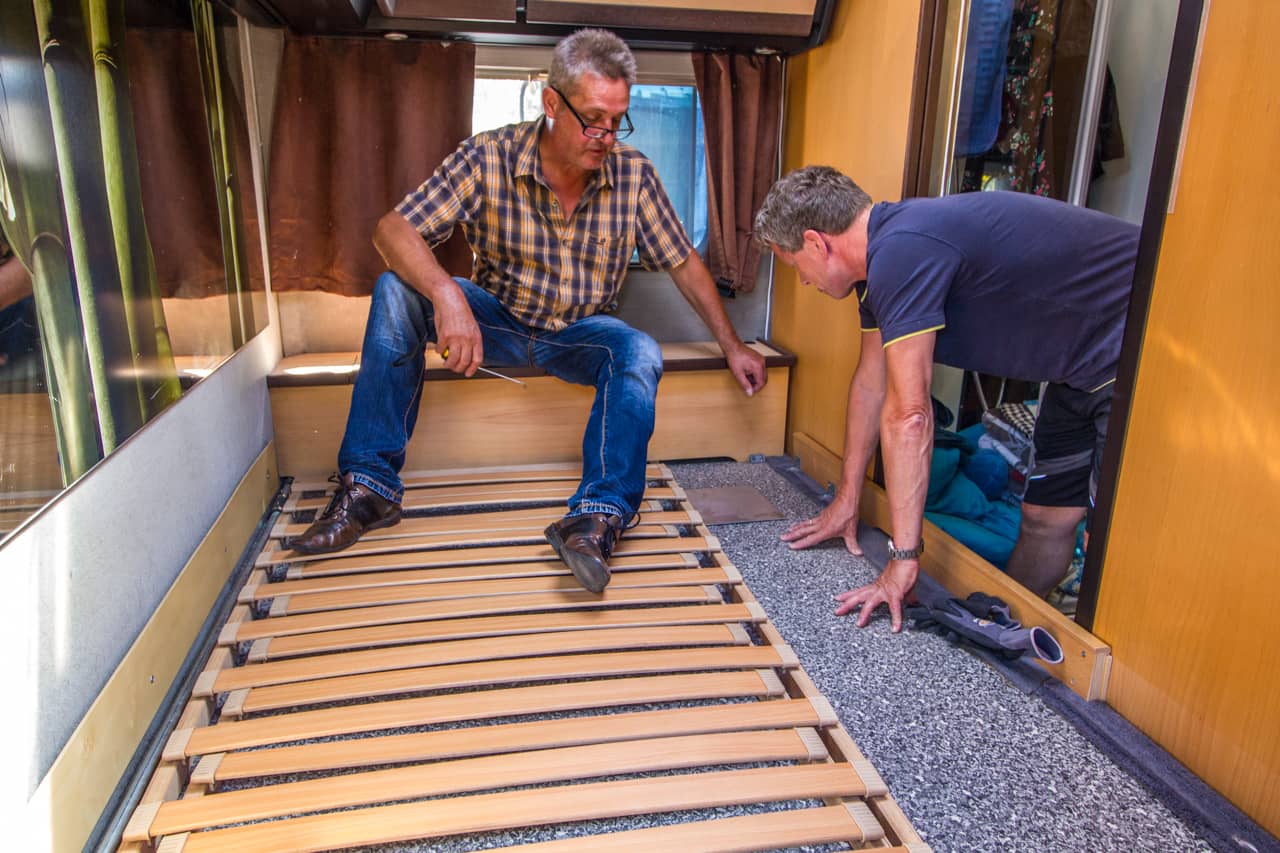 Nach dem Ausmessen fuhr ich unser Wohnmobil um das Werk herum zur Tischlerei, wo der Tischler sich um die Entfernung des alten Lattenrosts kümmerte. Dieses war fest verschraubt und mit einer Blende versehen, die angepasst werden musste. Auch für solche, unvorhersehbaren Momente ist man bei Froli jedoch vorbereitet und der Werkstischler hat das Problem im Handumdrehen gelöst.