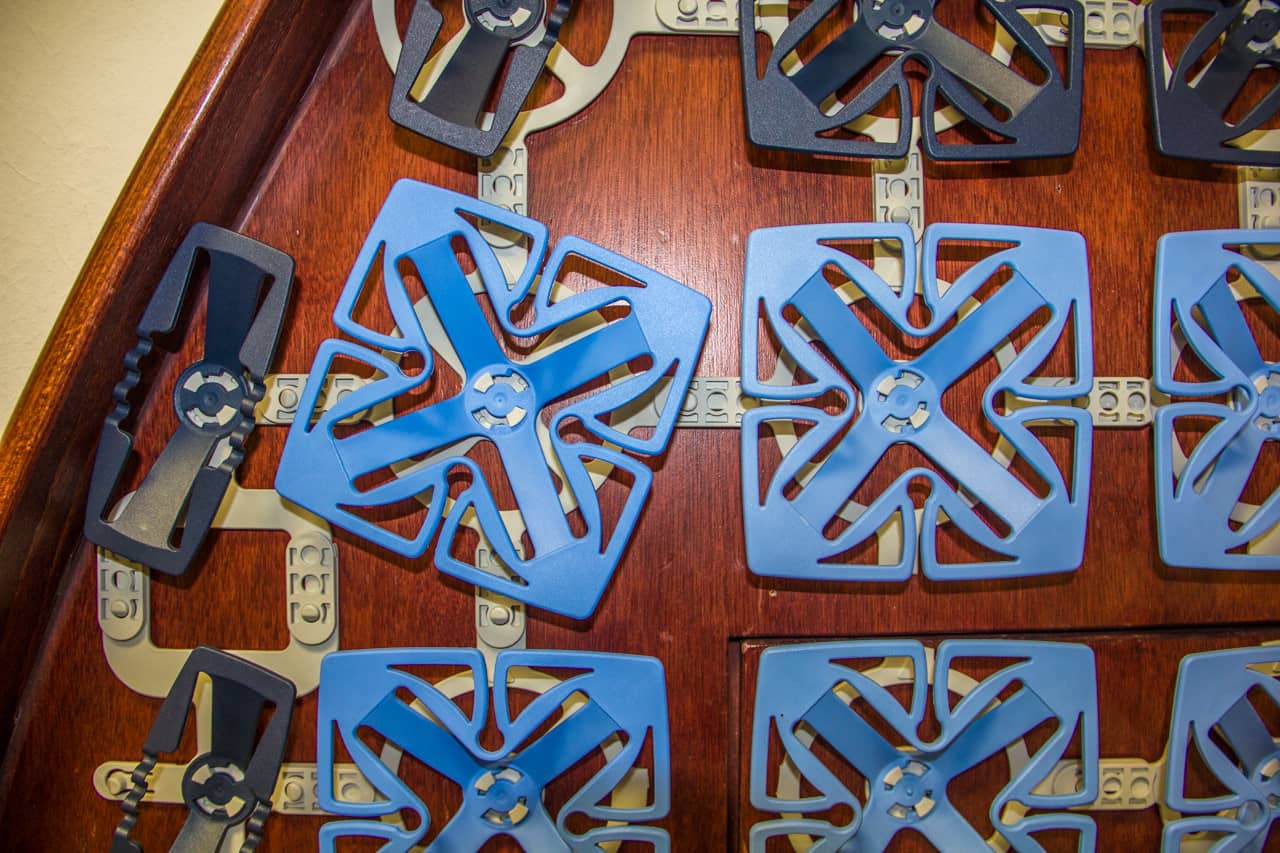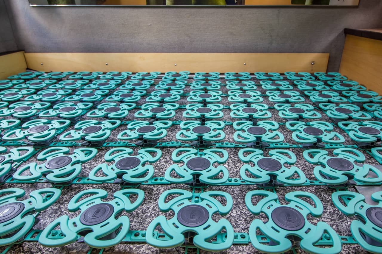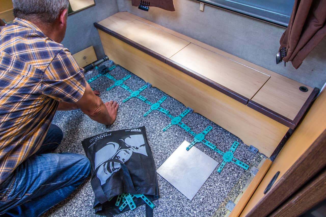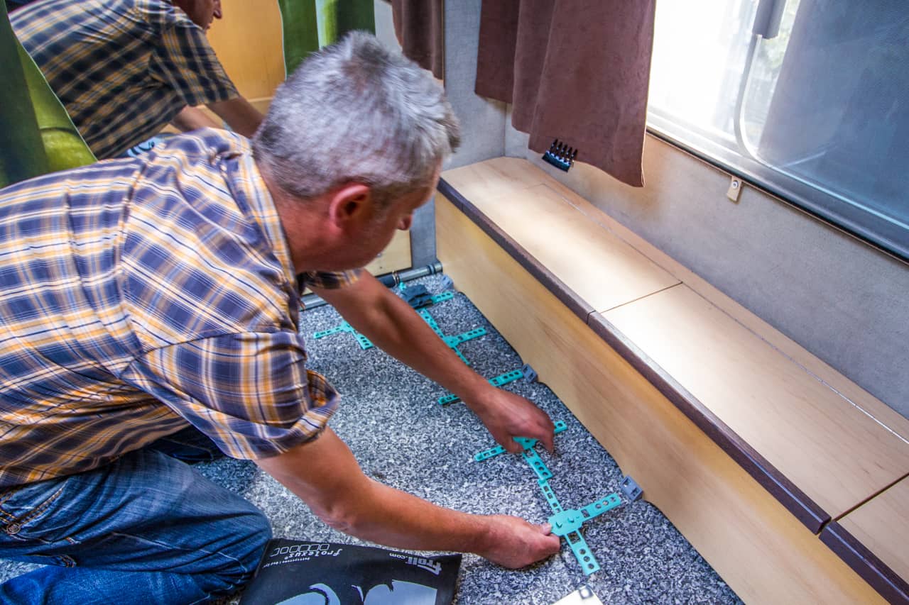 Insofern war ich froh, zusehen zu können, wie sich Herr Koch und Herr Schiermeyer mit jahrelanger Erfahrung des Einbaus annahmen. Zuerst legten sie in unserem Wohnmobil eine lange und eine kurze Seite aus und verklipsten die Elemente miteinander. So schufen sie zunächst einmal die richtigen Maße. Dann liefen wir mit diesem Grundgerüst in die Tischlerei, wo auf einem großen Tisch in Windeseile der Rest der Fußkreuze ergänzt und anschließend die Federelemente aufgesteckt wurden. Ich hätte dafür sicherlich deutlich länger gebraucht. Da die Federelemente sehr flexibel sind, würde ich beim Selbsteinbau das „Puzzeln“ außerhalb des Wohnmobils empfehlen, das ist doch deutlich stressfreier.