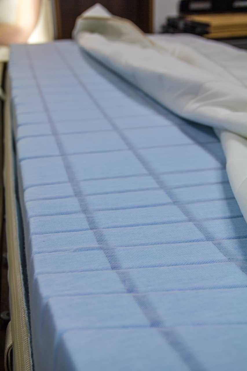 Wer wie wir keine Sorgen mit der Höhe im Schlafbereich und dem zugeladenen Gewicht seines Campers hat, der wird eher auf die Froli-Zona-Mobil-Elemente zurückgreifen. Diese haben mit 6 cm eine nahezu doppelt so hohe Aufbauhöhe wie die Froli-Travel-Elemente, sind aber durch die höhere Abfederung und die verschiedenen Härtezonen und Härtegrade individueller einstellbar und auch für schwergewichtige Schläfer geeignet. Vereinfacht gesagt, bedeutet die größere Höhe auch einen verbesserten Schlafkomfort.