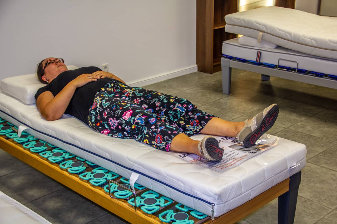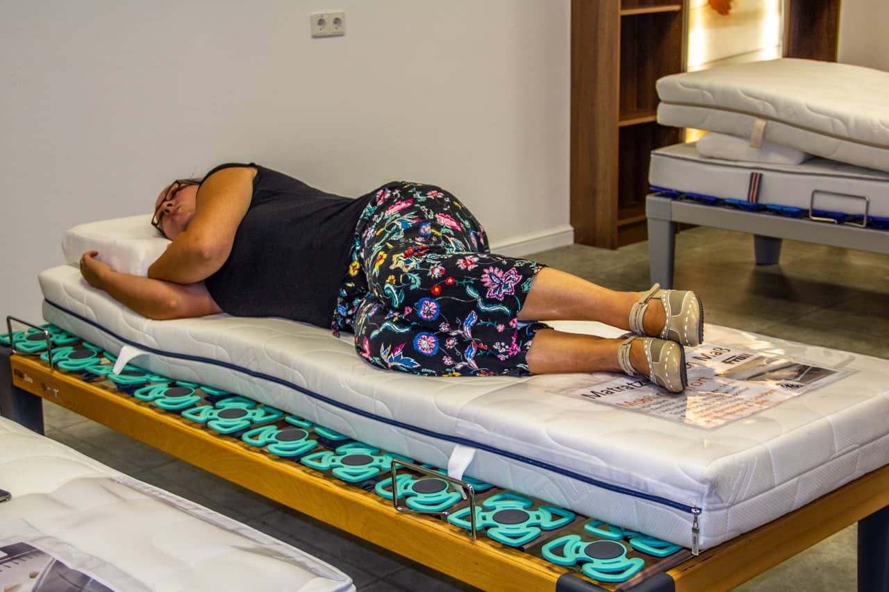 Herr Schiermeyer hat uns sehr geduldig erklärt, was für das perfekte Schlaferlebnis wichtig ist. Beispielsweise ist bei der Suche nach der richtigen Matratze zu bedenken, in welcher Position geschlafen wird. Auf dem Bauch? Auf der Seite? Auf dem Rücken? Jede Position bringt andere Anforderungen mit sich. Die bevorzugte Schlafposition sollte unbedingt beim Probeliegen eingenommen und auch mal gewechselt werden. Nur so kannst du erkennen, ob die Matratze und das Federsystem wirklich deinen Bedürfnissen entsprechen.
