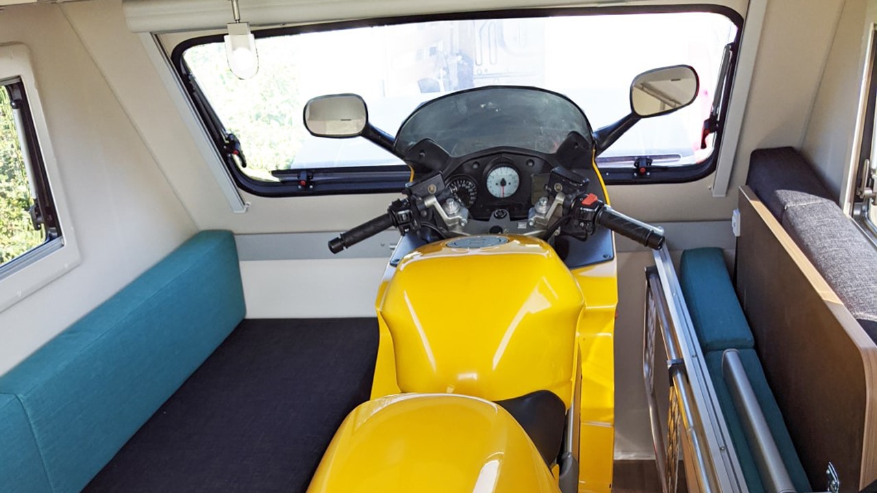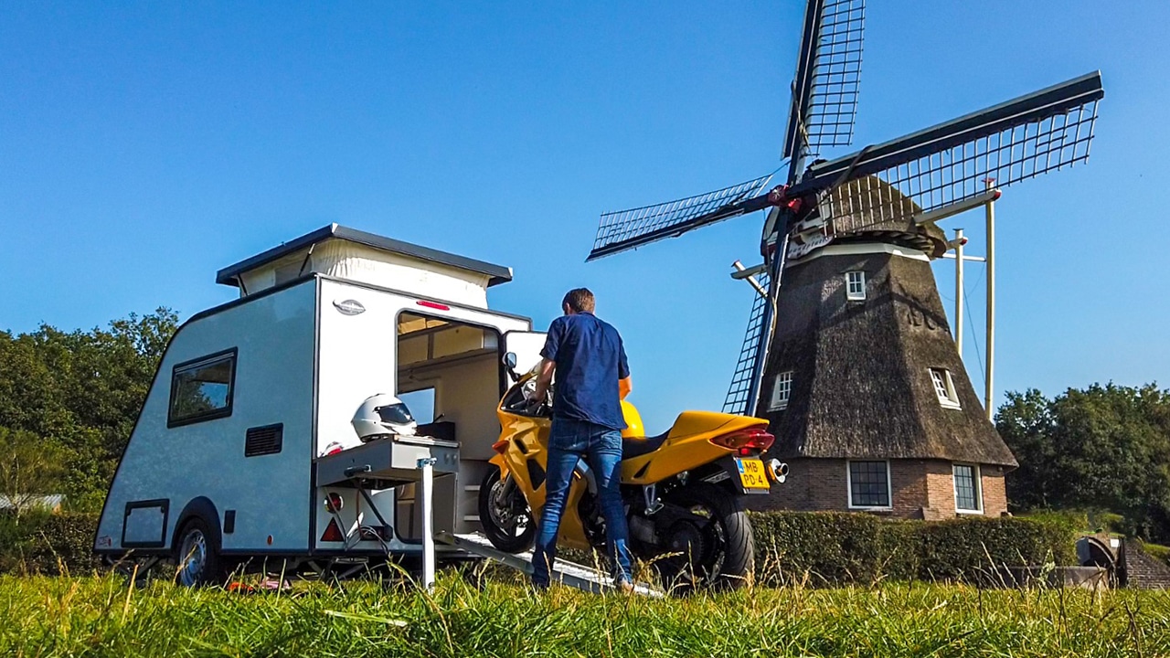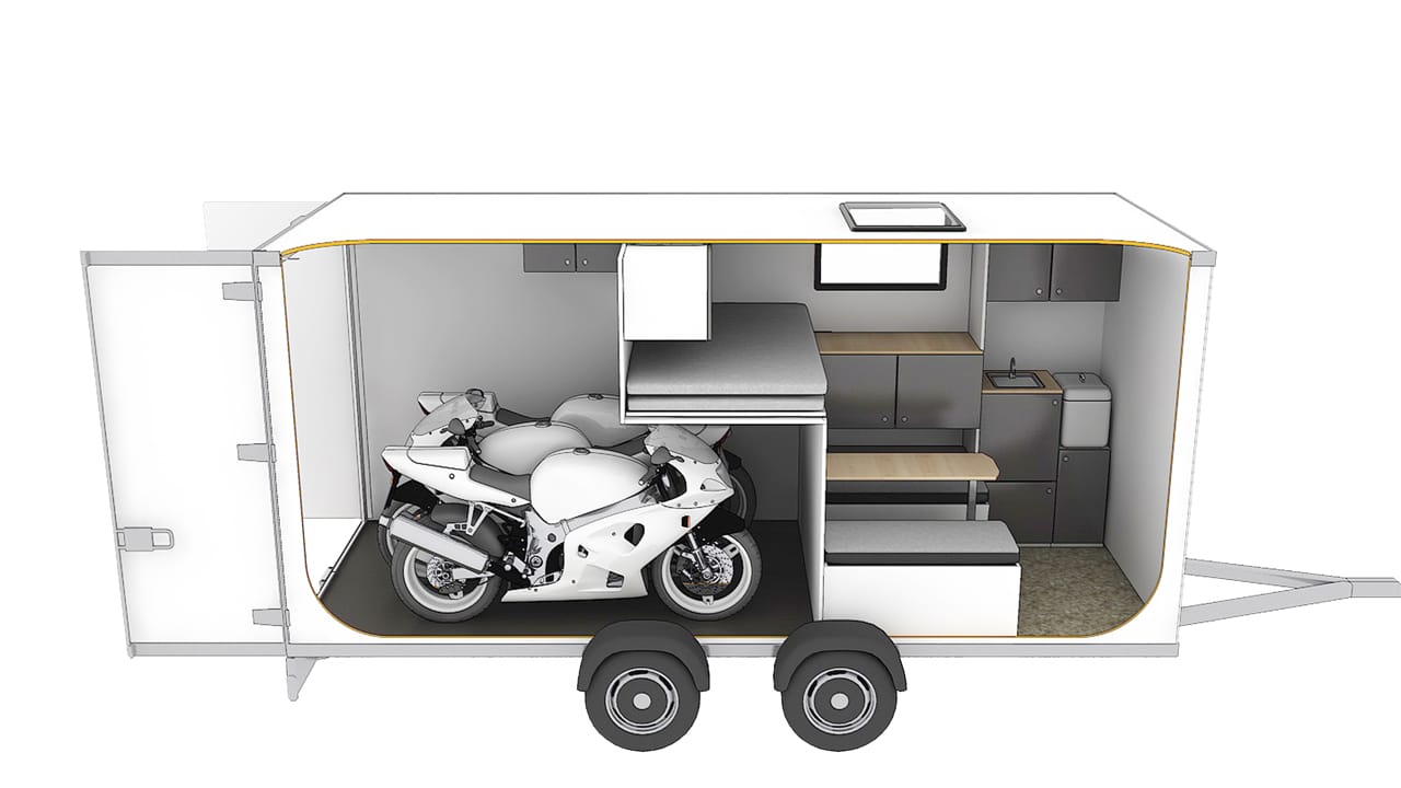 Vier Schlafplätze und bis zu drei Motorräder – bei den Modellen Cube 4 und Cube 5 des deutschen Herstellers Sportcaravan muss wahrlich niemand draußen bleiben. Auch nicht über Nacht! Hier sind Garage und Wohnraum voneinander getrennt. Die Ausstattung ist bei beiden Modellen im minimalistischen Industrial-Stil gehalten. Der Unterschied liegt im Detail: Während der Cube 5 sogar eine Nasszelle mit Dusche unterbringt, musst du im Cube 4 den Weg zur Gemeinschaftsdusche in Kauf nehmen und ansonsten mit einer im Schrank verstauten, ausziehbaren Campingtoilette auskommen. Eine Mini-Küche mit Spüle, Kocher und Kühlbox findest du aber in beiden. Auf Wunsch gibt’s beispielsweise das 100er-Zulassungspaket,  Alufelgen oder die Verlängerung der Garage um einen halben Meter gegen Aufpreis dazu.