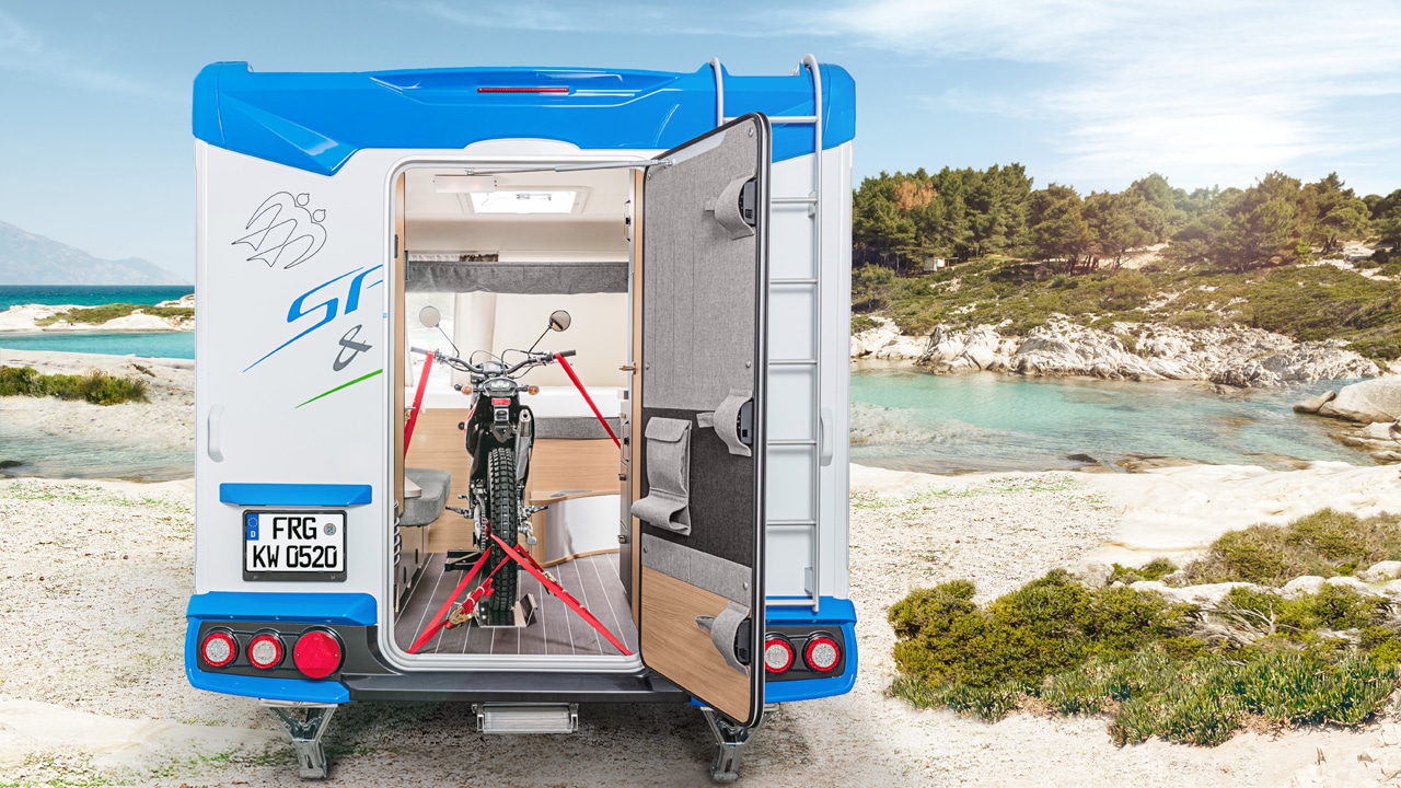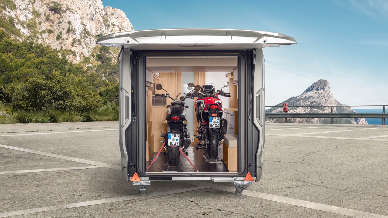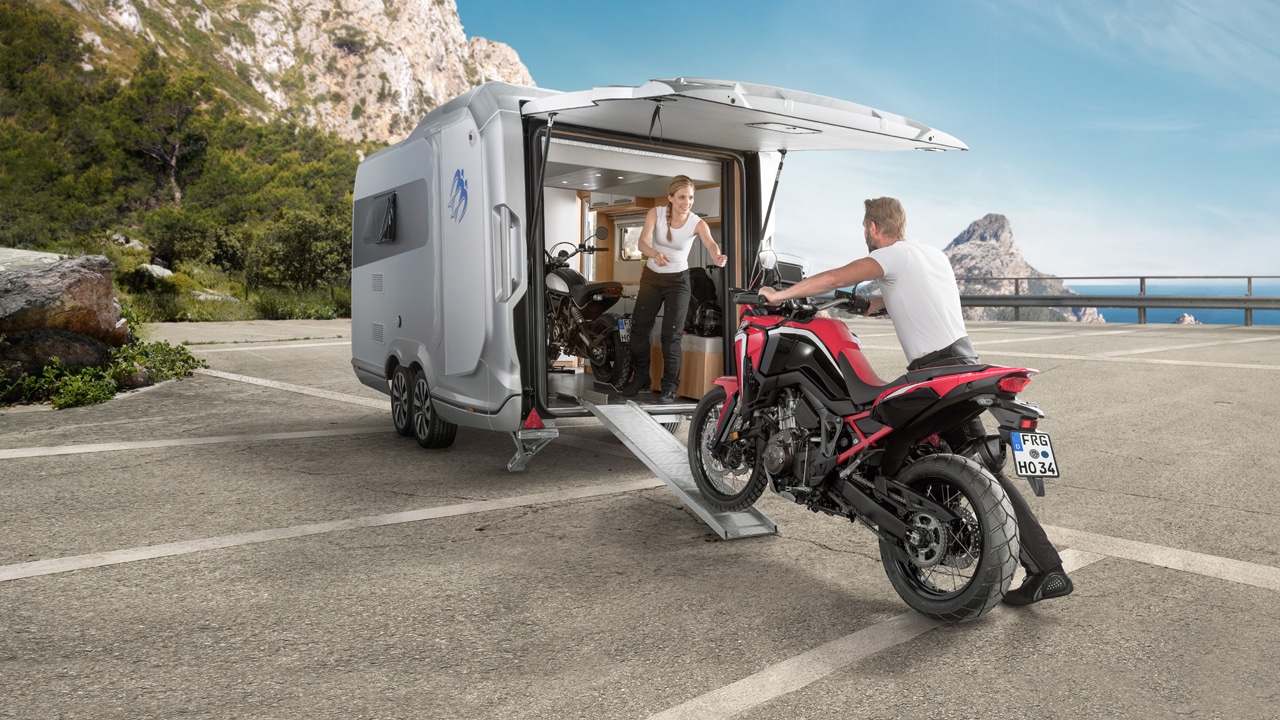 Urlaub im Wohnwagen und das Motorrad Schrägstrich das Quad Schrägstrich der Jetski sollen auch mit? Geht! Der Markt ist zwar recht übersichtlich, aber mehrere Hersteller haben sich spannende, flexible Lösungen einfallen lassen. Einige Modelle verfügen über eine vom Innenraum getrennte Garage, bei anderen musst du dich entscheiden, wer überdacht schläft: du oder deine Maschine. Alles Ansichtssache. Ich habe jedenfalls bei den Herstellern recherchiert und dir eine Übersicht mit einigen Modellen an Transport- sowie Sportcaravans zusammengestellt.