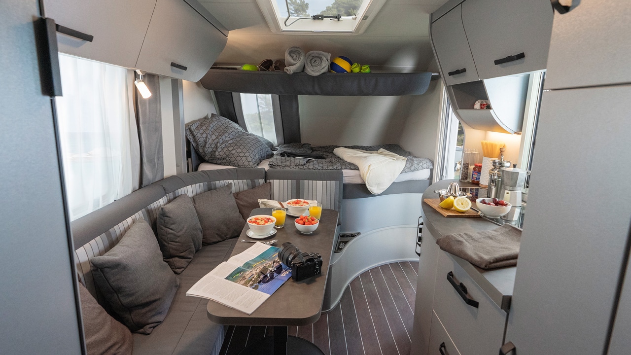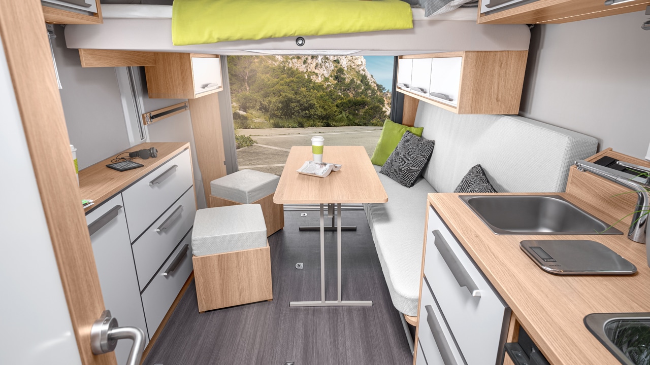 Noch mehr Platz auf weniger Fläche: Der zweite Caravan aus dem Hause Knaus ist noch ein bisschen flexibler und kompakter. Im DESEO können dank variabler Raumaufteilung und guter Balance zwischen Nutz‐ und Wohnraum sogar zwei (!) Motorräder transportiert werden. Die müssen allerdings auch weichen, damit sich der DESEO am Reiseziel angekommen in einen vollausgestatteten, komfortablen Caravan mit viel Stauraum, Kühlschrank, Spüle, Zwei-Flammen-Kocher, Nasszelle und Schlafplätzen für bis zu vier Personen verwandelt. Viel Komfort findet hier auf kleinem Raum statt! Selbst ein (für die Fahrt versenkbarer) LED-TV darf hier nicht fehlen!