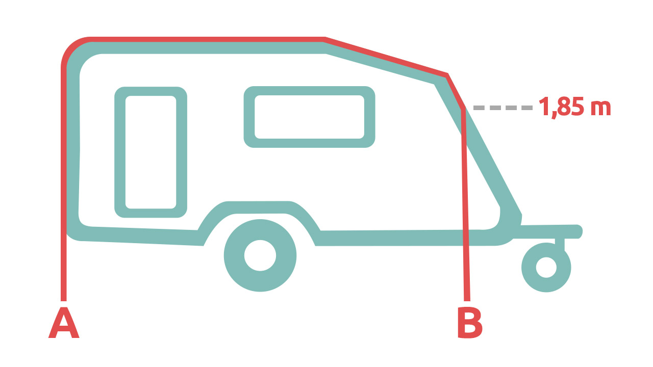 - Beim aerodynamischen Wohnwagen (Bild 1) misst du nun zuerst vorne am Bug die Höhe von 1,85 m und markierst dir diesen Punkt. Dann misst du vom Boden (A) über diesen Punkt in einer geraden Linie nach oben, dann entlang der Kante weiter bis zur Kederschiene, weiter durch die Länge der Schiene und auf der anderen Seite wieder bis zum Boden (B).